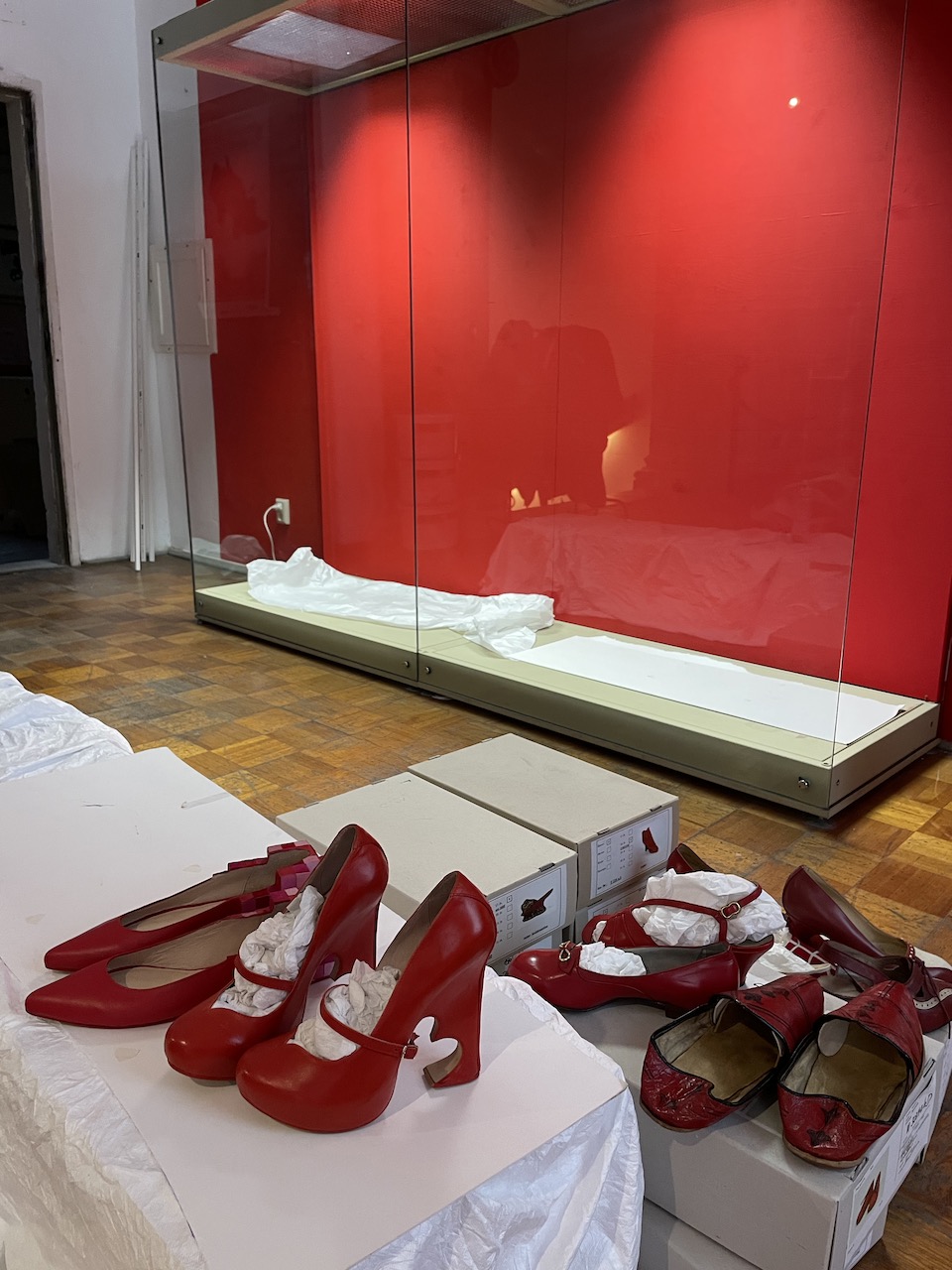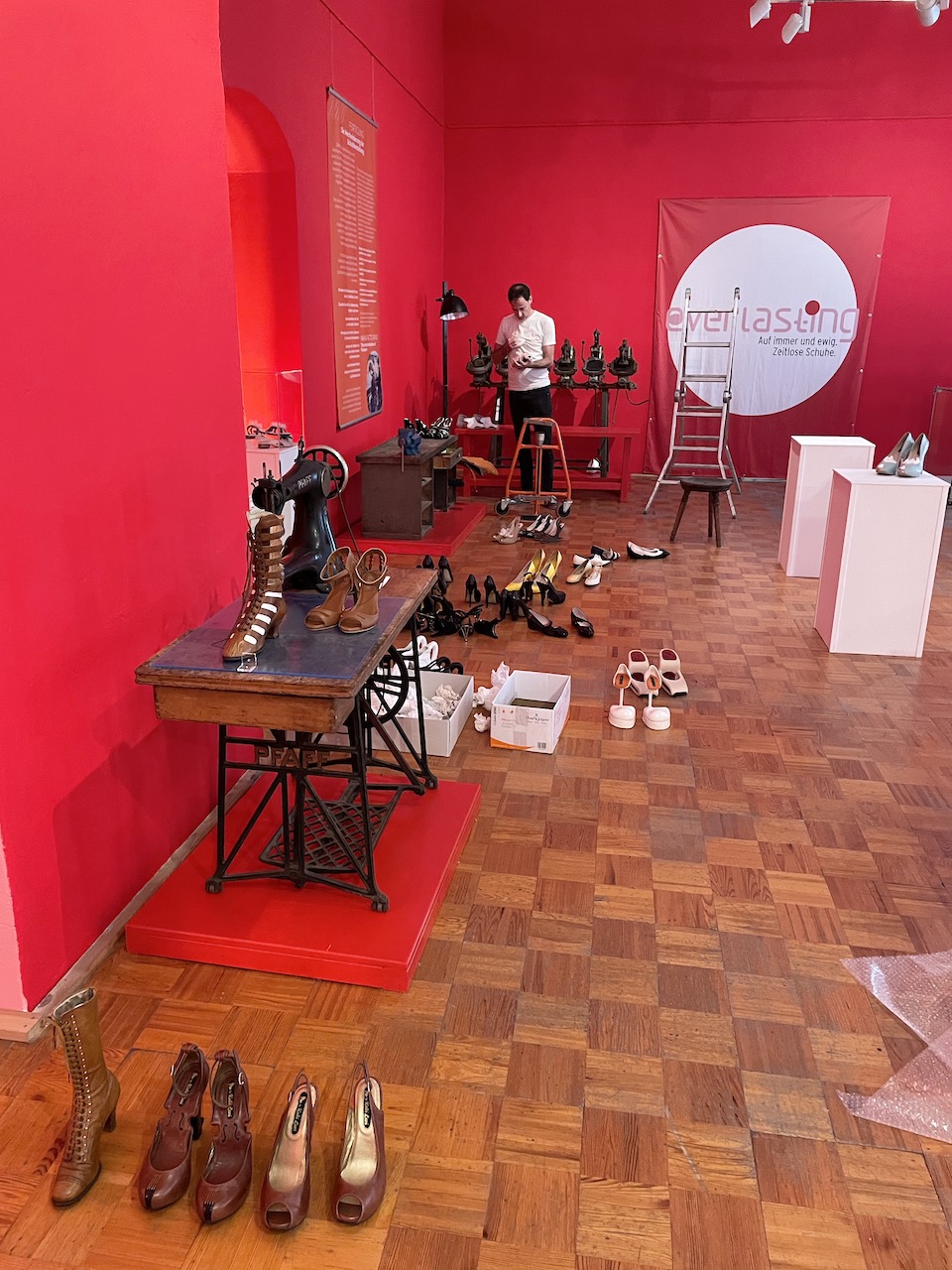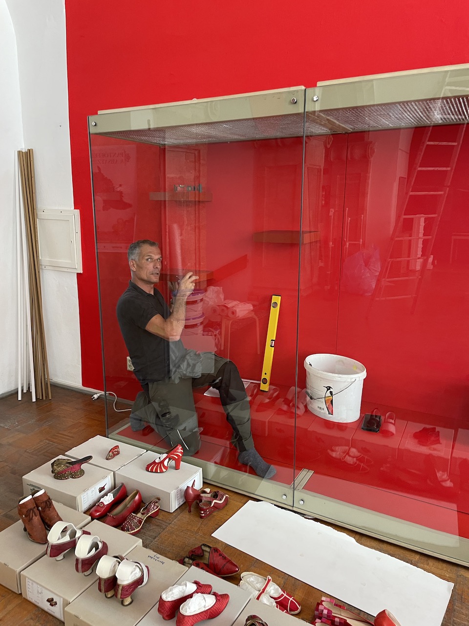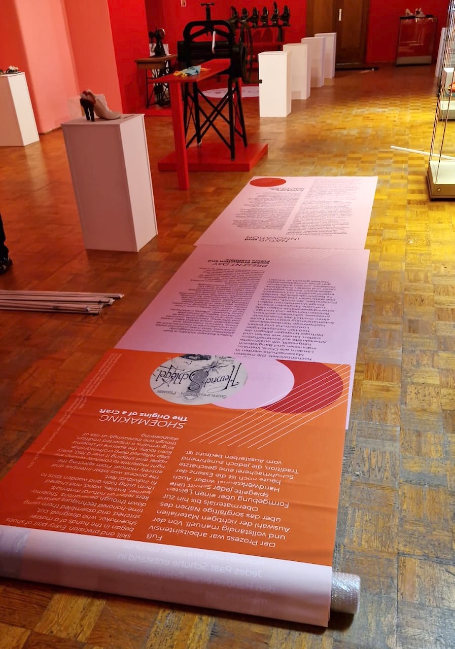 Schuhe auswählen; Gruppierungen Kobi-Levi-Design/Weißenfelser Sammlung bilden; Vitrinentypen und -größen sowie Standorte festlegen, weitere Objekte (Schuhmaschinen, Möbel etc. auswählen); Objekte fotografieren; Farbgestaltung der Ausstellungsräume, Grafikdesign im Haus und in der Ausstellung sowie Werbemittel und -kampagne besprechen und viele kleine Dinge am Rand, die auch wichtig sind…