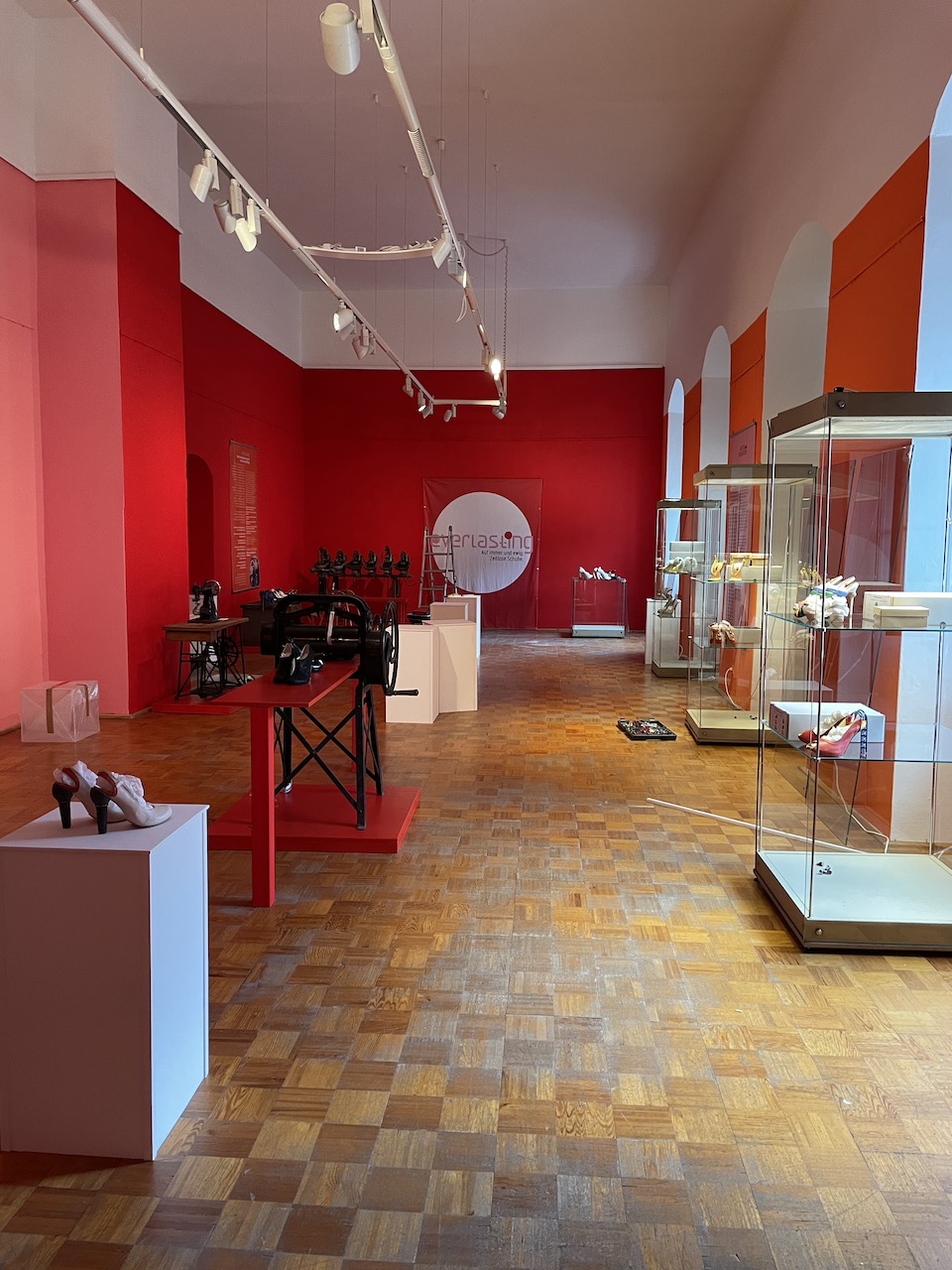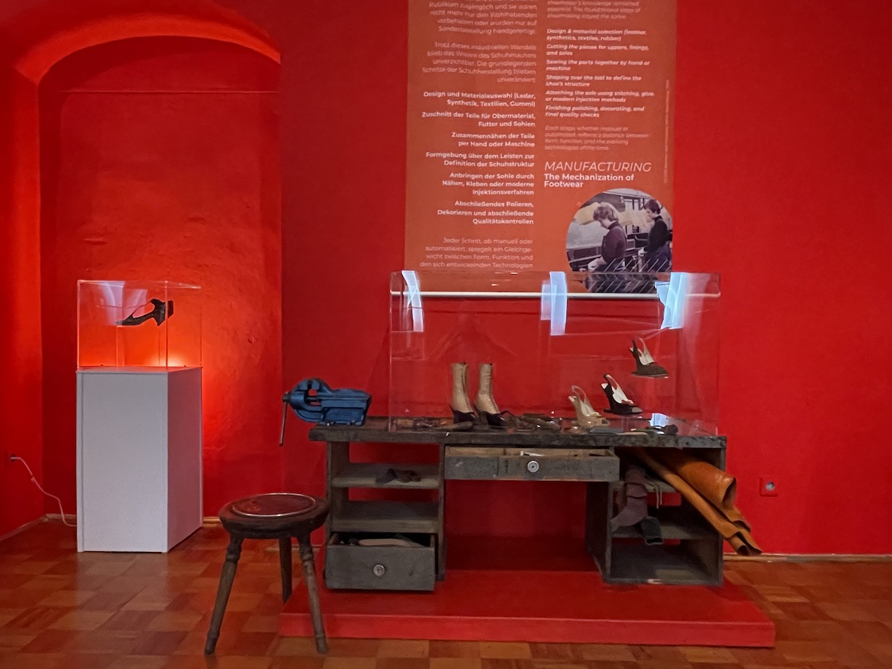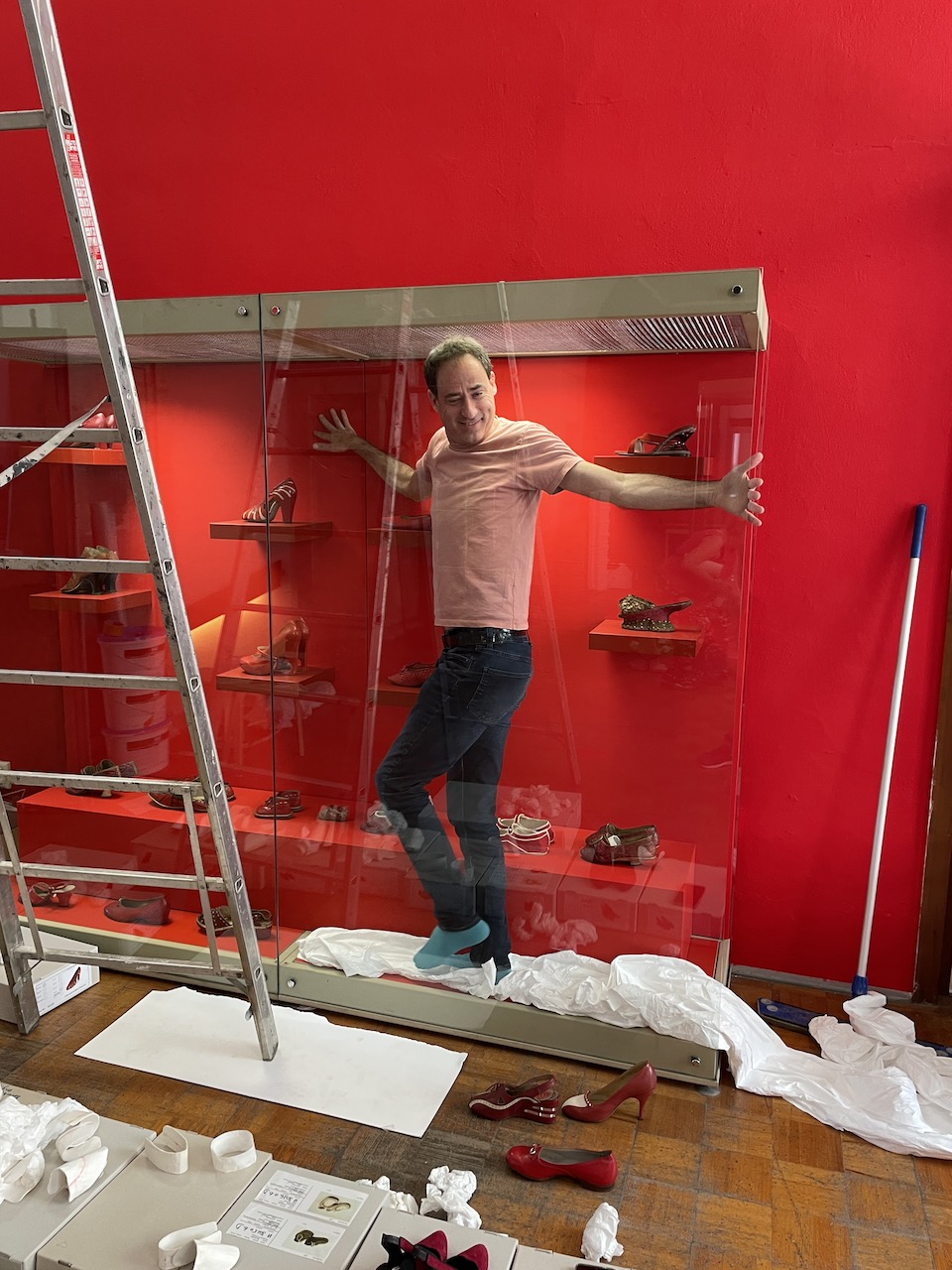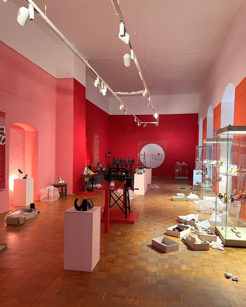 Schuhe auswählen; Gruppierungen Kobi-Levi-Design/Weißenfelser Sammlung bilden; Vitrinentypen und -größen sowie Standorte festlegen, weitere Objekte (Schuhmaschinen, Möbel etc. auswählen); Objekte fotografieren; Farbgestaltung der Ausstellungsräume, Grafikdesign im Haus und in der Ausstellung sowie Werbemittel und -kampagne besprechen und viele kleine Dinge am Rand, die auch wichtig sind…