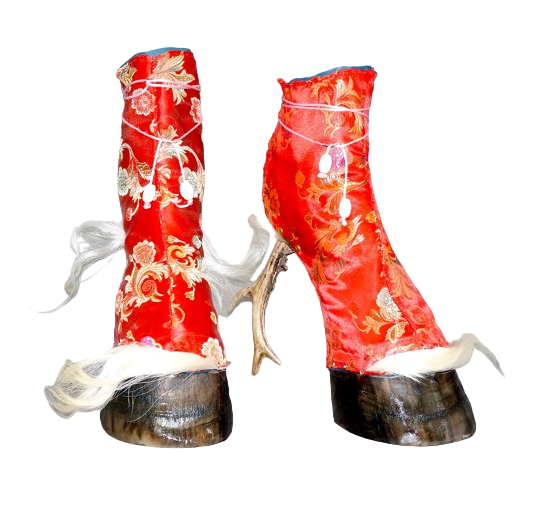 Pferdehufe, Chinesische Kunstseide, Pferdehaare, Hirschgeweih und Holz.