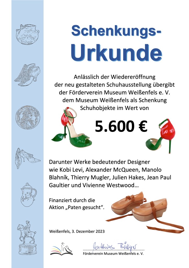 Anlässlich der Eröffnung des neu gestalteten Teils der Schuhausstellung am 14. Januar 2023 übergibt der Verein dem Museum weitere 24 Paar Schuhe, die mit Hilfe von Paten und Sponsoren angekauft werden konnten.