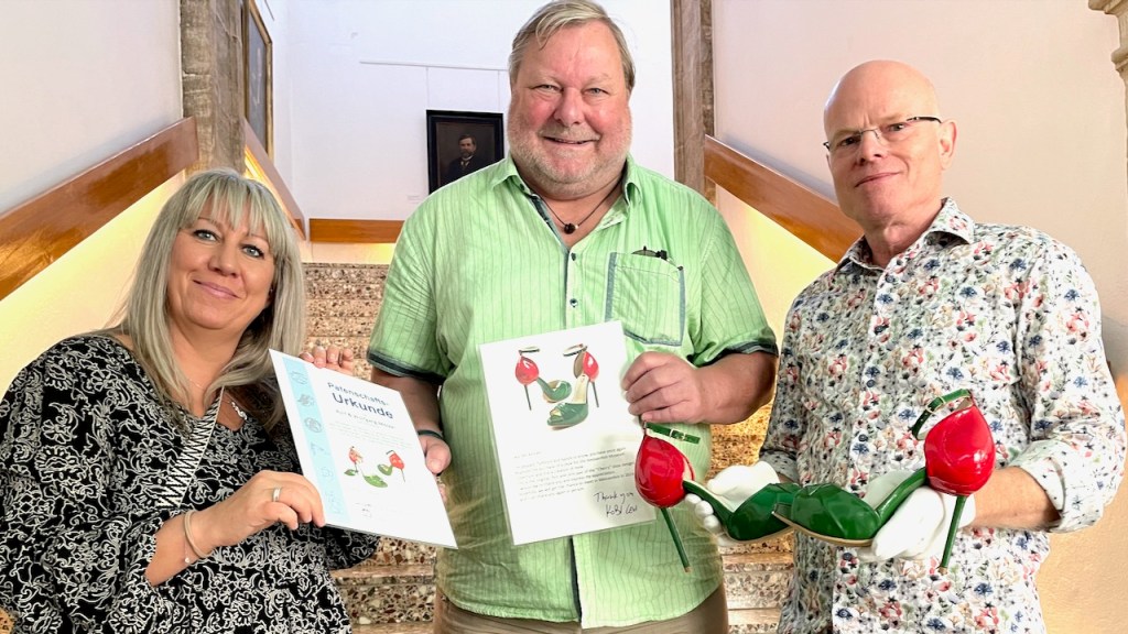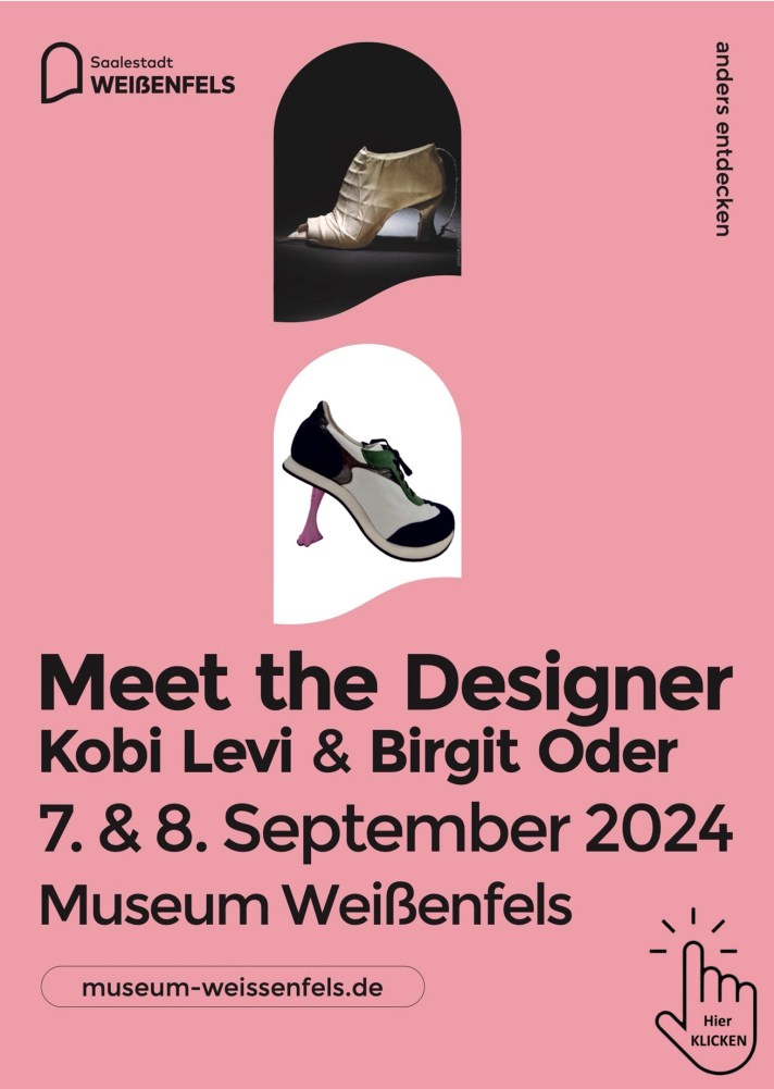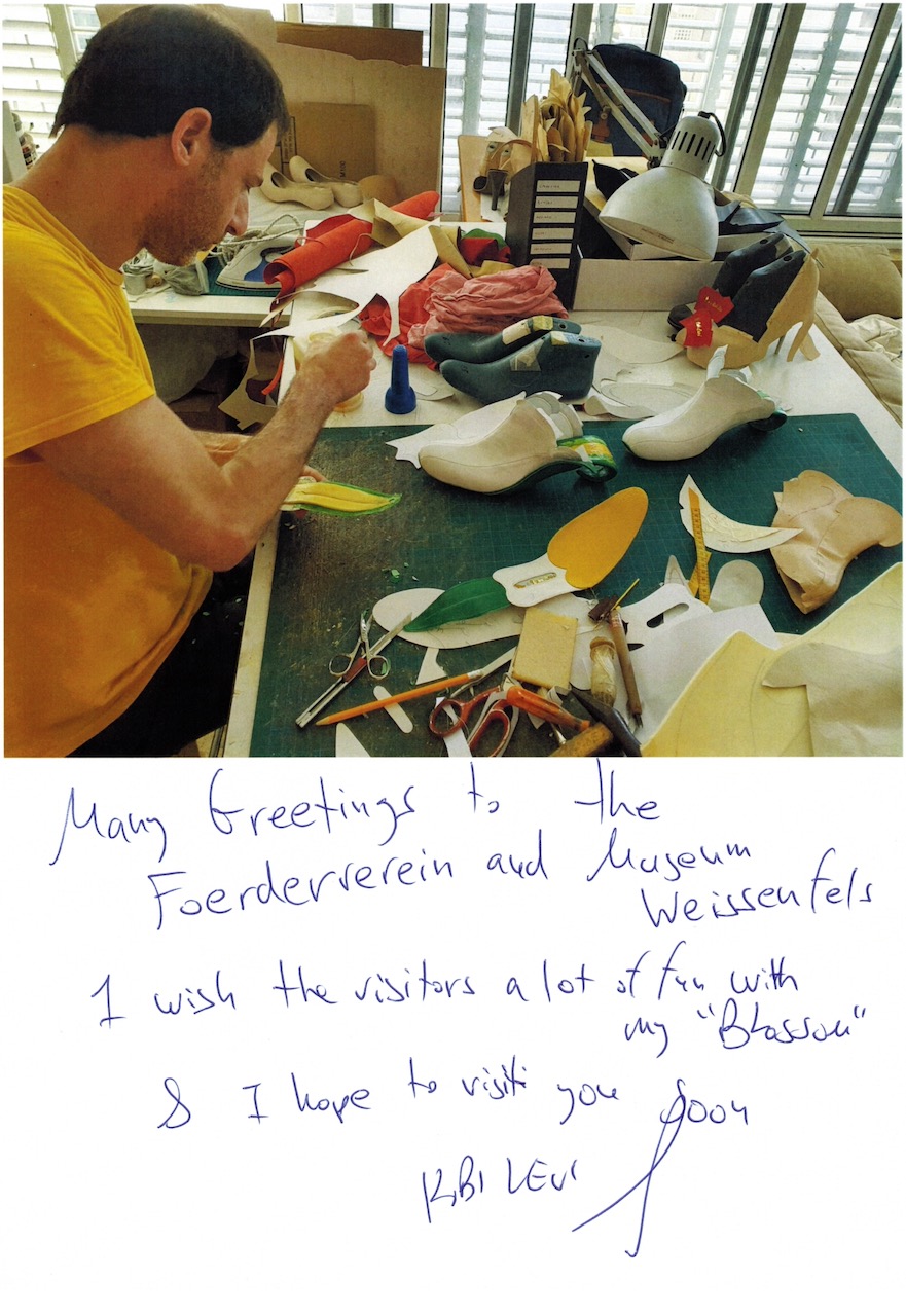 Levi, Künstler und Schuhdesigner, war gerührt, als anlässlich der Ausstellungseröffnung Matthias Böttger, Vorsitzender des Vereins der Freunde des städtischen Schuhmuseums, das als eines der führenden seiner Branche in Europa gilt, ihm zu Ehren aus Weißenfels in Deutschland kam.