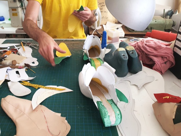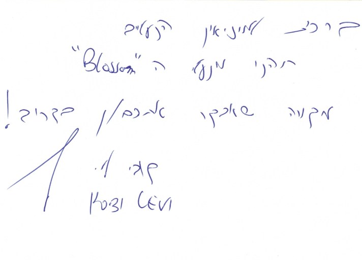 Wir bekamen Fotos zur Entstehung – vom Entwurf über das Pappmodell bis zum fertigen Schuh. Er schickte uns ein Foto mit einem Gruß, englisch und hebräisch. Und er hat die Schuhe signiert.
