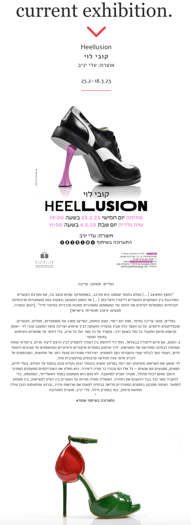 …Schuhe – Ein grundlegendes Konsumprodukt, ein Alltagsgegenstand, aufgeladen und begehrt, der ein Netz von Bedeutungen, Symbolen, Verbindungen, Konflikten und Impulsen darstellt. An dieser Nahtstelle zwischen Fantasie und Verlangen und Gebrauch und Konsum arbeitet der Designer Kobi Levi – ein handwerklich begabter Handwerker, der jeden Schuh manuell verarbeitet, dabei auf jede Naht und jedes Detail achtet, ohne die Möglichkeit der Nutzung des Endprodukts aufzugeben.