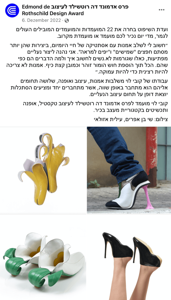 Er schreibt auf Facebook: „Ich fühle mich geehrt und geschmeichelt, mit einer unglaublichen Gruppe von Designern einer der Finalisten für den Edmond de Rothschild Design Award zu sein“.