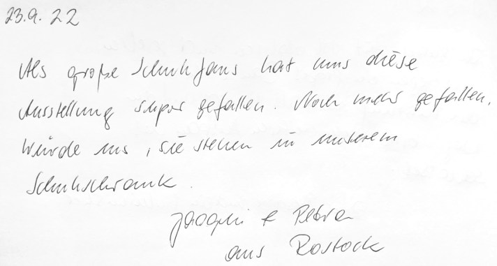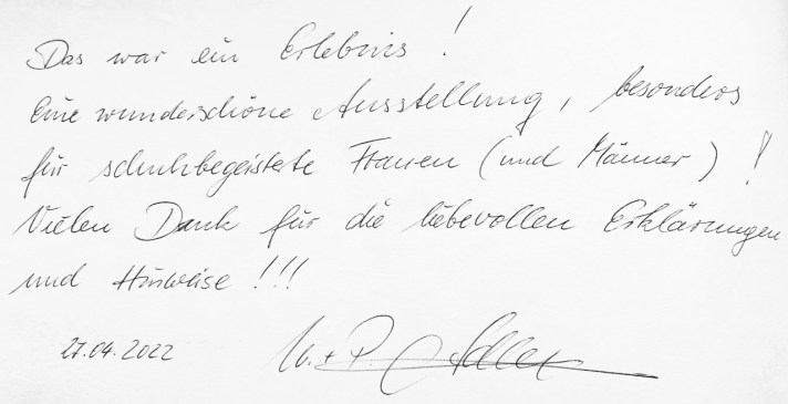„Da mir die Ausstellung mit den Designerschuhen heute so gut gefallen hat, … habe ich mich entschieden, noch die Patenschaft… zu übernehmen.“ R. K.