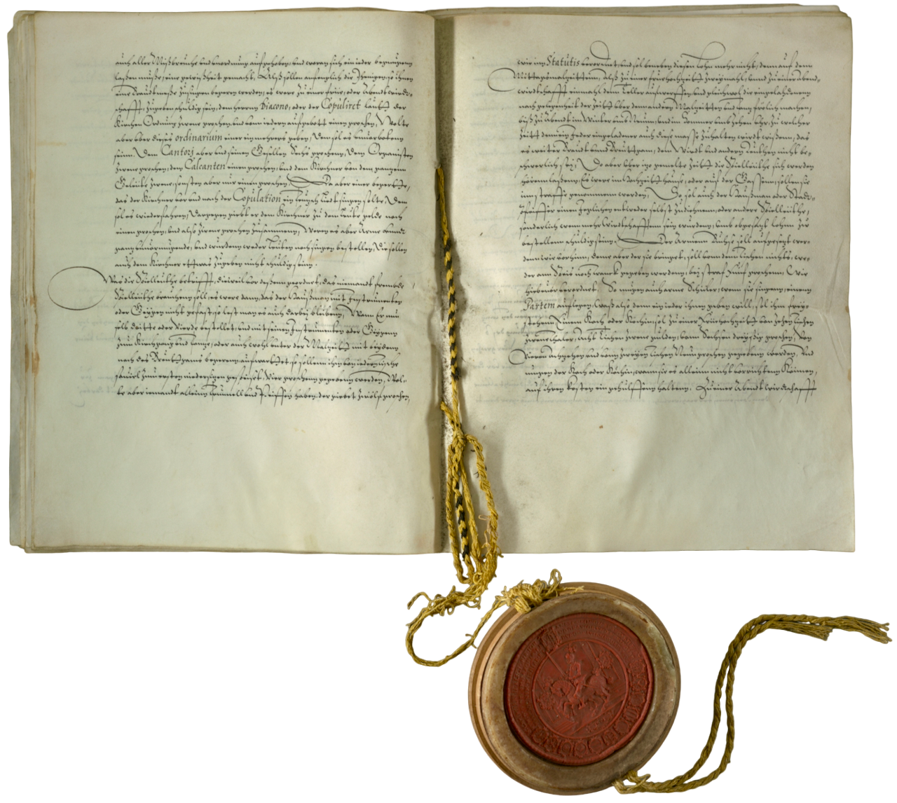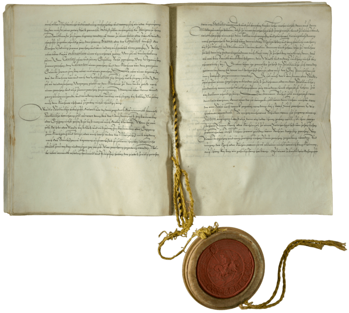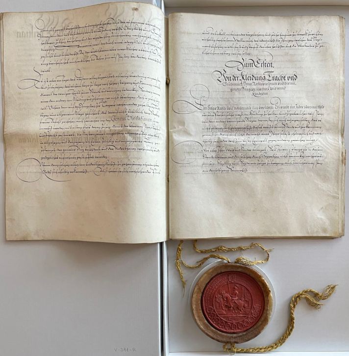 Unten vor und oben nach der Restaurierung. Die Urkunden wurden gereinigt, geglättet, Fehlstellen im Papier geschlossen. Die Kleiderordnung mit dem Siegel in einer Stülpschachtel fixiert.